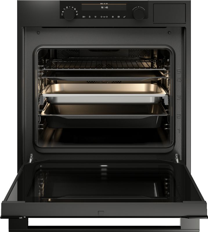 De intuïtieve bediening van de oven gaat via de massief metalen draaiknoppen links en rechts van het display en de oplichtende toetsen onder het kleuren TFT scherm. Met de linkerknop wordt eenvoudig de hoofdfunctie gekozen. Hierdoor is er altijd een overzicht over alle functies en heeft u directe toegang tot de belangrijkste functies. Na het selecteren van de hoofdfunctie wordt het exacte programma gekozen met de rechterknop en vervolgens temperatuur en indien gewenst tijd ingesteld. De rechterknop is een draai-/drukknop. Draaien om de juiste waarde te kiezen, drukken om door te gaan naar de volgende instelling.