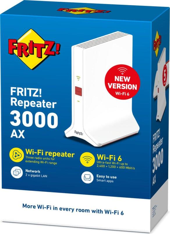 Met de FRITZ!Repeater 3000 AX geniet u van een nog groter en sterker WiFi bereik dan ooit te voren. De FRITZ!Repeater 3000 AX beschikt over een gecombineerde maximale WiFi snelheid van 3000 AX Mbit/s verspreid over drie frequentiebanden, waarvan twee op de 5 GHz frequentie en één op de 2,4 GHz frequentie. De maximale snelheid op de eerste 5 GHz frequentieband is 2400 Mbit/s, de tweede 5 GHz frequentieband 1200 Mbit/s en de derde 2,4 GHz frequentieband 600 Mbit/s, en alle drie de frequentiebanden kunnen gelijktijdig in gebruik worden genomen. De FRITZ!Repeater 3000 AX beschikt over 2 Gigabit LAN aansluitingen en kan als WiFi repeater of LAN-bridge worden ingesteld.