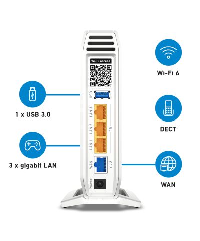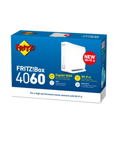 De FRITZ!Box 4060 is een triband-WiFi-router met 4 x 4 WiFi 6 (WiFi AX) inclusief Multi-User MIMO (MU-MIMO) en Mesh WiFi-functie. Het nieuwe vlagschip uit de 40-serie is het eerste model van deze serie, die een DECT-basisstation met DECT ULE heeft, waardoor telefonie en smarthome-functies mogelijk zijn. Daarnaast zorgt een 2,5 Gbit/s WAN-poort voor een razendsnelle internetverbinding op bijvoorbeeld een kabel- of glasvezelmodem. De WAN-poort kan desgewenst ook als extra 2,5 Gbit/s LAN-poort worden gebruikt. Door de drie Gigabit ethernetaansluitingen kunnen computers of netwerkapparaten met gigabitsnelheden in het thuisnetwerk worden geïntegreerd. Bovendien zijn in de FRITZ!Box 4060 een VoIP-telefooncentrale en een NAS met een snelle USB 3.0-aansluiting geïntegreerd.