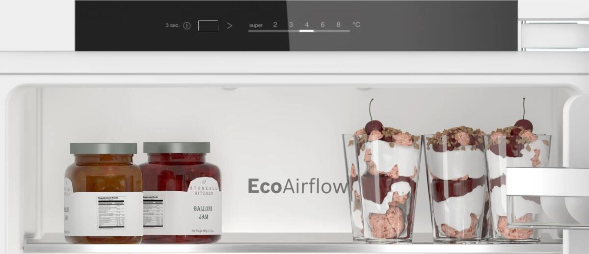 De Bosch KIR31VFE0 is speciaal ontworpen om een optimale koelomgeving te creëren. Het apparaat heeft een geluidsniveau van slechts 35 dB(A), waardoor het vrijwel geruisloos werkt. Dit is ideaal voor open keukens en zorgt ervoor dat je optimaal kunt genieten van je leefruimte. Tevens zorgt de Eco Airflow-technologie voor een constante luchtcirculatie, wat de versheid van je etenswaren aanzienlijk verlengt.