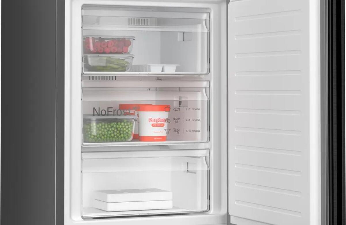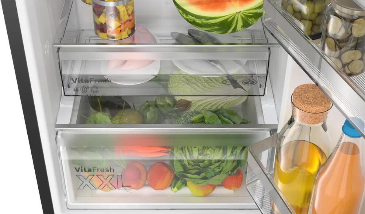 De Bosch koelvriescombinatie KGN39EXCF is een slimme keuze voor jouw keuken. Deze vrijstaande koel-vriescombinatie biedt zowel modern design als geavanceerde technologie. Met zijn stijlvolle geborsteld zwarte staal afwerking, dat ook nog eens vingerafdrukken voorkomt, maakt deze combinatie niet alleen indruk qua uiterlijk, maar ook qua functionaliteit. Het Total No Frost systeem zorgt ervoor dat je nooit meer de vriezer hoeft te ontdooien, wat een enorme besparing van tijd en moeite oplevert.