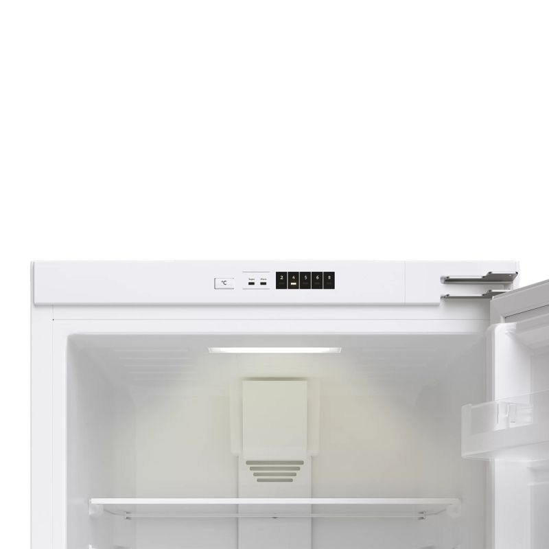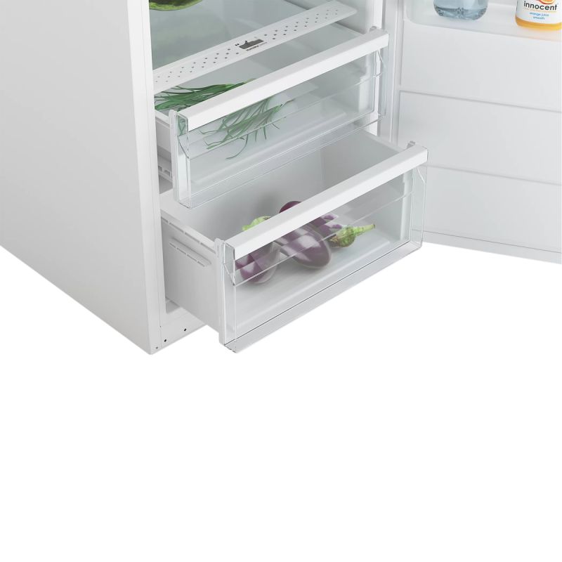 De ETNA KKS5178 is een luxe inbouwkoelkast van 178 cm hoog die van alle gemakken en de nieuwste technieken is voorzien. Om te beginnen heeft het ruime koelgedeelte met een inhoud van 294 liter maar liefst vijf glazen legplateaus en twee grote groenteladen. ETNA bouwde de heldere led-verlichting bovenin het koelgedeelte zodat er een optimale lichtverdeling is. Dankzij de Multi Air Flow techniek, waarbij een ventilator voor een continue luchtstroom zorgt, is de temperatuur in het koelgedeelte overal hetzelfde. Enorm handig, want dit geeft de vrijheid om je boodschappen te bewaren waar dat voor jou het handigste is. Een ander groot voordeel zijn de twee transparante groenteladen, waarvan één met luchtvochtigheidsregeling. De lage temperatuur in deze lade, in combinatie met de vochtigheidsregeling, zorgt ervoor dat groenten en fruit langer vers blijven. De gewenste koeltemperaturen zijn elektronisch in te stellen. Dankzij de SuperCool functie zorg je ervoor dat je nieuwe boodschappen snel op de gewenste temperatuur gebracht worden. De ETNA KKS5178 wordt ingebouwd met het zogeheten sleepdeursysteem en de draairichting van de deur kan bij het inbouwen gekozen worden.