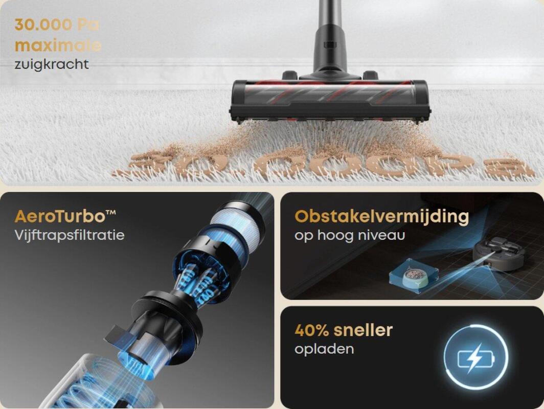 De robotstofzuiger EUFY Robot Vacuum 3-in-1 E20 biedt een unieke combinatie van kracht en gebruiksgemak. Het AeroTurbo™ 5-traps filtratiesysteem vangt 99,97% van de fijne stofdeeltjes op, waardoor je huis schoner en gezonder blijft. Bovendien is het apparaat ontworpen om moeiteloos om obstakels te navigeren dankzij de geavanceerde laser-technologie. Dit zorgt voor een probleemloze schoonmaakervaring, zonder dat je je zorgen hoeft te maken dat de stofzuiger vastloopt.