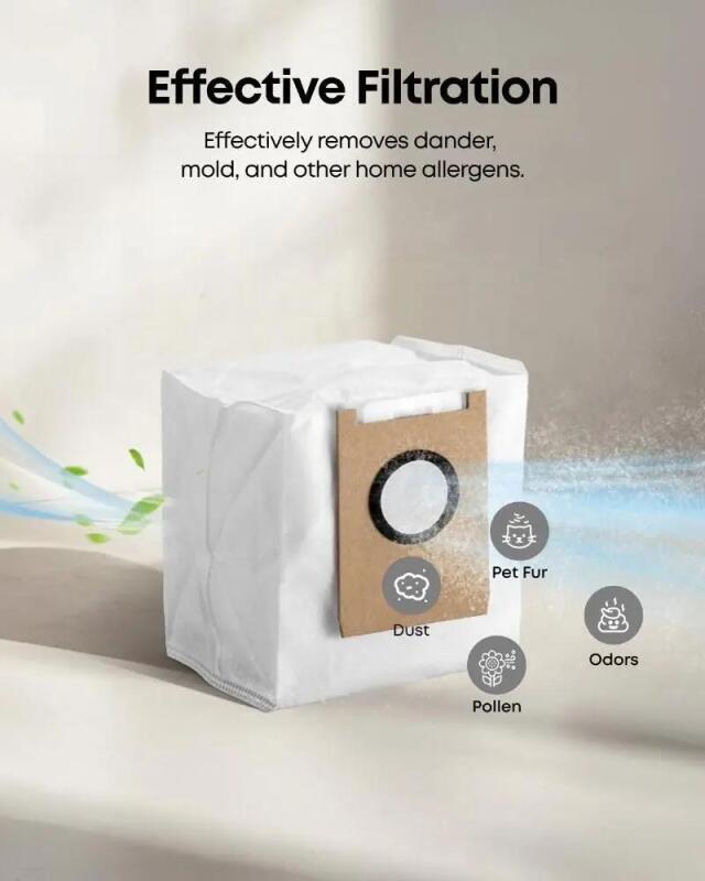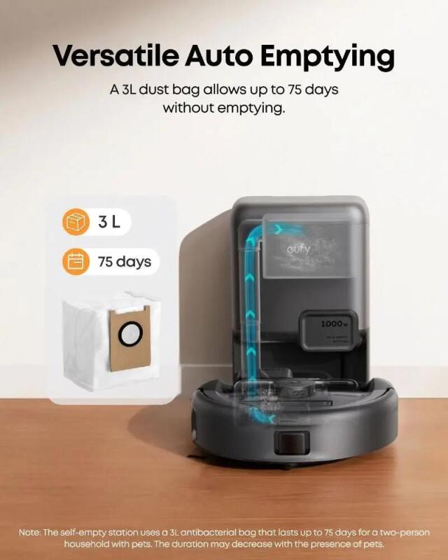 Veelzijdig automatisch legen: Met een ruime stofzak van 3 liter geniet u tot 75 dagen lang van handsfree schoonmaken. De 3-pack vervangingsset zorgt voor langdurig onderhoudsgemak.