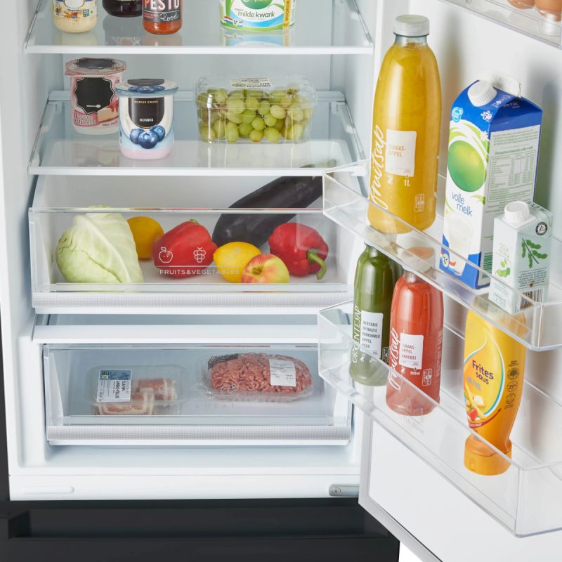 De Inventum koelvriescombinatie KV1850B is ontworpen met de gebruiker in gedachten. De koelruimte is uitgerust met drie glazen draagplateaus, een vershoudlade en een groentelade, allemaal met handige led-verlichting. De vershoudlade is speciaal ontworpen om etenswaren zoals vlees en vis langer vers te houden, dankzij de temperatuurregeling die aan de koeltemperatuur is gekoppeld. Hierdoor kun je met deze koelvriescombinatie optimaal profiteren van de voordelen van vers voedsel.
