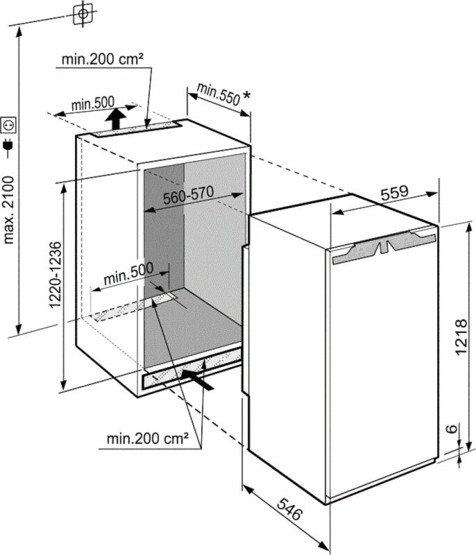 Min. nisdiepte 550 mm