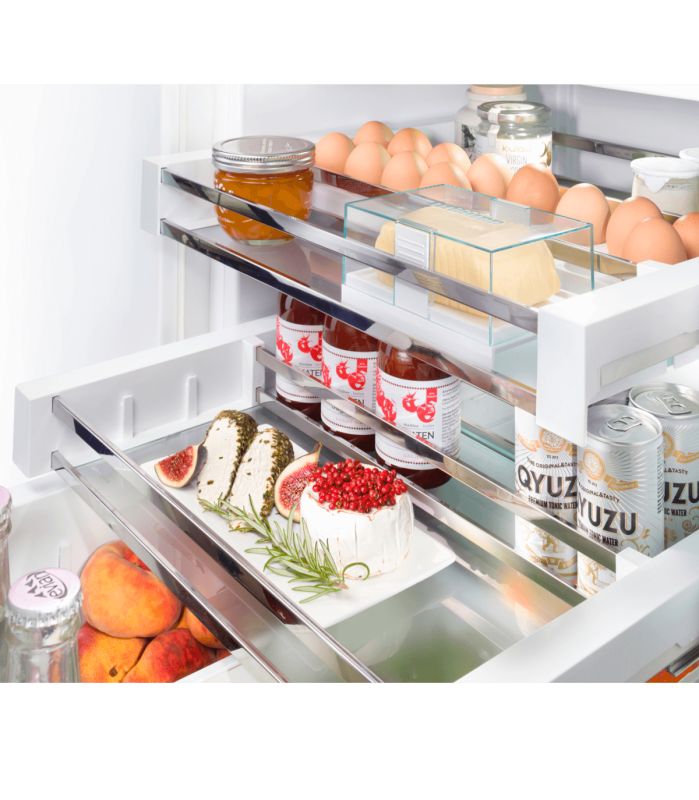 De volledig uittrekbare koelwagen met SoftTelescopic sluiting beschikt over twee uittrekbare glasplateaus met railverdelers, een aparte flessenruimte en een uitneembare groente- en fruitlade. Deze grote lade kan worden verdeeld in twee gelijke delen. Onder de grote lade is extra plaats om kleine producten te bewaren.