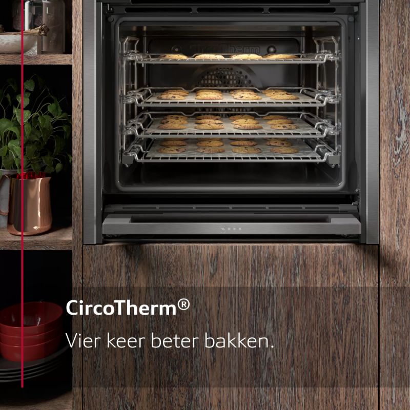 Al je gerechten tegelijk in de oven, zonder van hoogte te moeten wisselen? Circo Therm® maakt het mogelijk. Het buitengewone en unieke heteluchtsysteem zorgt dat je hele oven gelijkmatig verwarmd wordt. Of je de bakplaat nu boven of onder in de oven zet: je kunt altijd rekenen op hetzelfde resultaat. Maak je een heel menu uit de oven? Dan bak je alles op tot wel vier ovenniveaus tegelijk af met Circo Therm®. Zo bespaar je energie en bak je beter en makkelijker dan ooit.