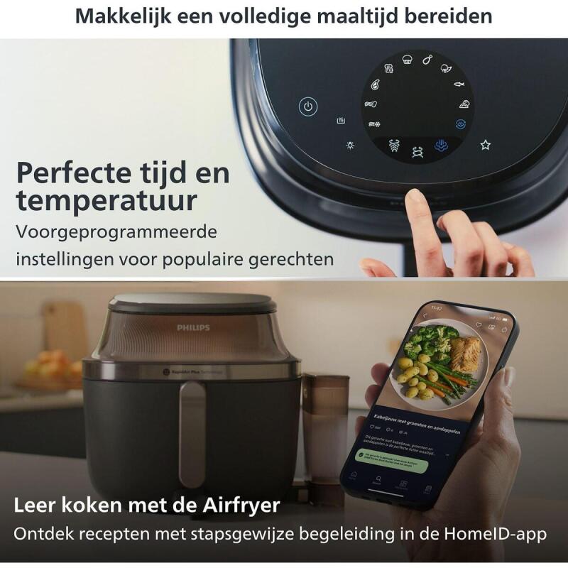 De Philips airfryer NA547/07 laat je experimenteren met verschillende recepten via de HomeID-app. Ontdek een schat aan heerlijke recepten met stapsgewijze begeleiding en maak van elke maaltijd een feest. Of je nu een ervaren kok bent of net begint, deze airfryer biedt voor ieder wat wils.