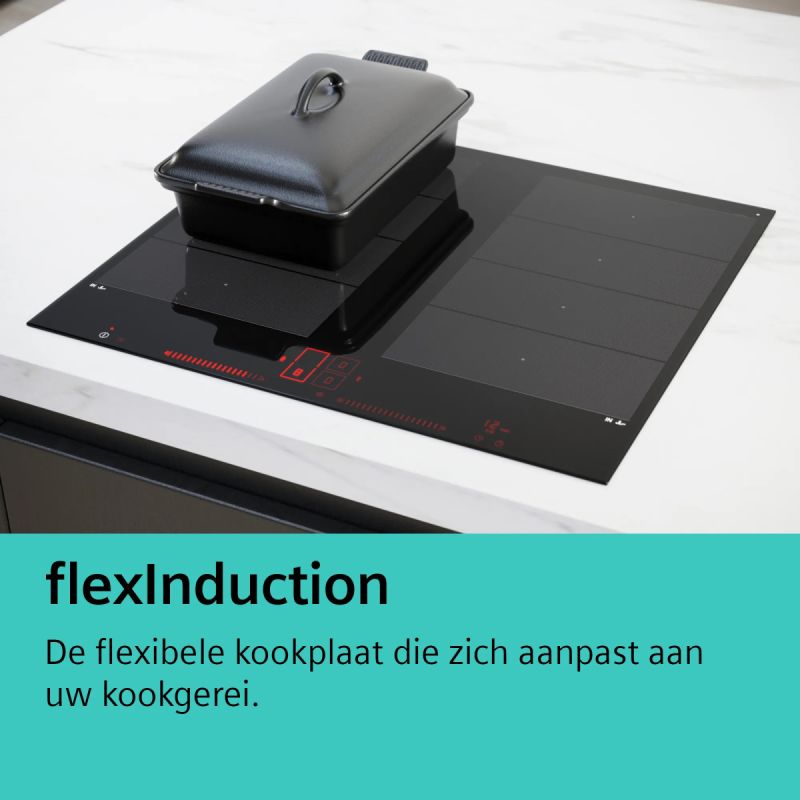 Met flexInduction wordt de flexibele kookzone automatisch uitgebreid wanneer je extra grote pannen gebruikt (tot 24 cm diameter). De kookplaat lost het probleem op door meer inductiespoelen te activeren, wat zorgt voor een gelijkmatige verhitting. Een braadslee, teppanyaki of grillplaat (tot 40 cm breed) verwarmen? Dat is nu makkelijker dan ooit.