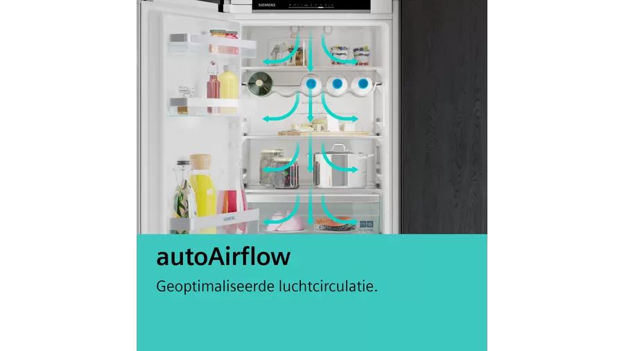 Het AutoAirflow-systeem verdeelt de lucht gelijkmatig doorheen de hele koelkast, zodat alle niveaus een constante temperatuur behouden. Je producten worden sneller koel en blijven lekker vers.