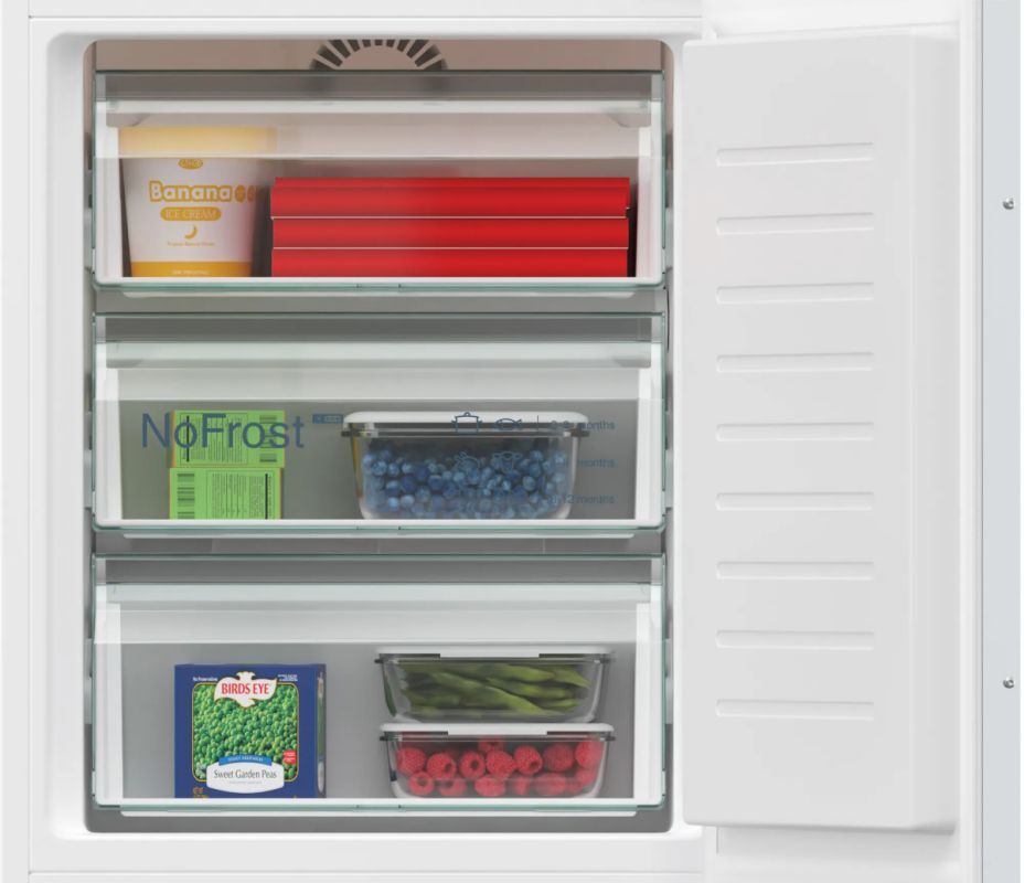 Je hoeft je vriezer niet meer te ontdooien om je bevroren eten goed te bewaren en het apparaat energiezuinig te houden.De noFrost-technologie verwijdert vocht en houdt de lucht droog. Hierdoor kan zich geen ijs vormen op de wanden van je vriezer en ingevroren etenswaren. Dat bespaart jou de moeite van het ontdooien. Bovendien bespaart het energie, want een ijsvrije vriezer werkt efficiënter.