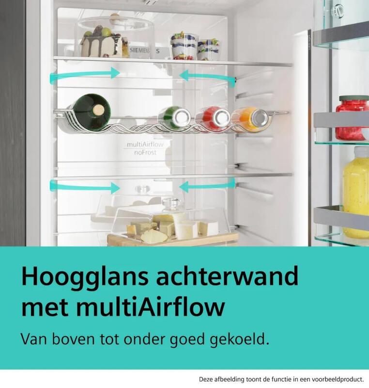 Dit model beschikt over het hyperFresh systeem, waarmee je groenten en fruit langer vers blijven. De koelruimte is bovendien voorzien van een hoogglans achterwand met multiAirflow-technologie, die zorgt voor een gelijkmatige temperatuur in de koelkast. Met de superKoelen functie kun je snel nieuwe boodschappen koelen, wat ideaal is na een bezoek aan de supermarkt.