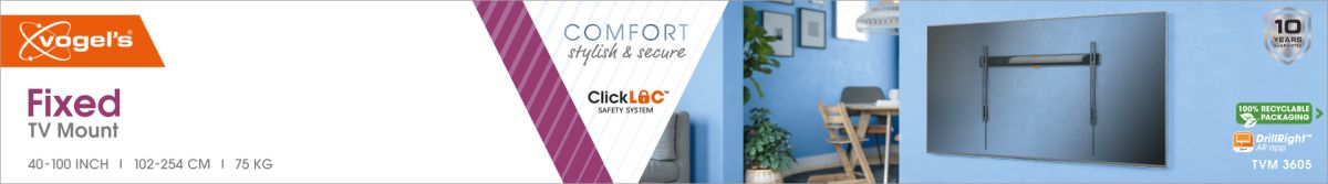 Een ongeluk zit in een klein hoekje. Dus bevestig je je kostbare tv het liefst zo plat en veilig mogelijk tegen de muur. De COMFORT Fixed tv beugel is daar ideaal voor. Hiermee hangt je tv niet alleen veilig, maar ook nog eens heel mooi en stijlvol. Het unieke ClickLoc™ veiligheidssysteem zorgt ervoor dat je tv met een hoorbare klik zit vergrendeld. Zachte patches op de beugel beschermen de achterzijde van je tv tegen mogelijke krassen tijdens het monteren.