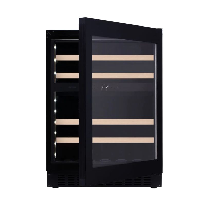 Deze wijnklimaatkast met vol glazen deur zonder greep van 71,5cm hoogte voor 46 flessen met uitschuifbare plateaus is de ideale oplossing voor wie een aantal flessen wijn in huis wil bewaren en direct op temperatuur wil kunnen serveren. Deze onderbouw wijnklimaatkast met push to open systeem heeft een deurhoogte van 72 cm, één van onze modellen van 60 cm. breed. Een veel gebruikte standaard onderbouw maat makkelijk te integreren in uw keuken, bar of meubel. De temperatuur kan worden ingesteld van +5°C t/m +20°C, boven en beneden, de bovenste zone dient altijd minimaal – 1 °C kouder ingesteld te worden dan de onderste zone. De deur van deze wijnklimaatkast is zowel links- als rechtsdraaiend te monteren en beschikt over pootjes waarmee u de kast op oneffen ondergrond kunt verstellen. Ten opzichte van de deur kan de plint van deze wijnklimaatkast maximaal 11,5 cm naar achter inspringen en is minimaal 10cm hoog. Uw keukenplint kunt u daarmee zonder problemen door laten lopen.